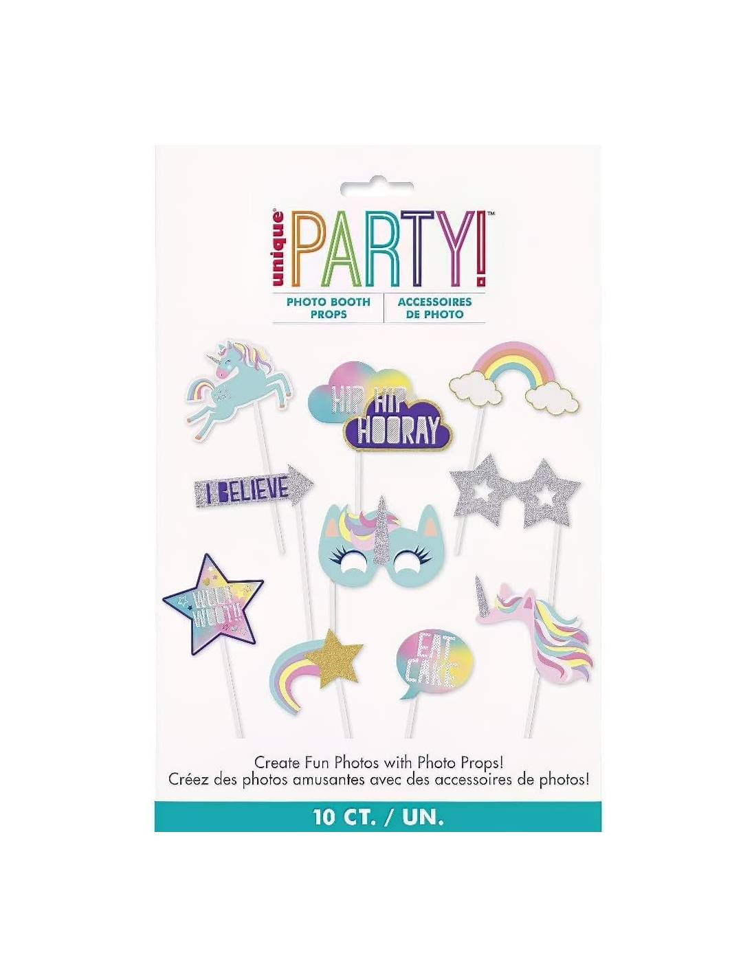 Kit de 10 accesorios de photocall con temática de unicornio, perfecto para fiestas infantiles y celebraciones temáticas.