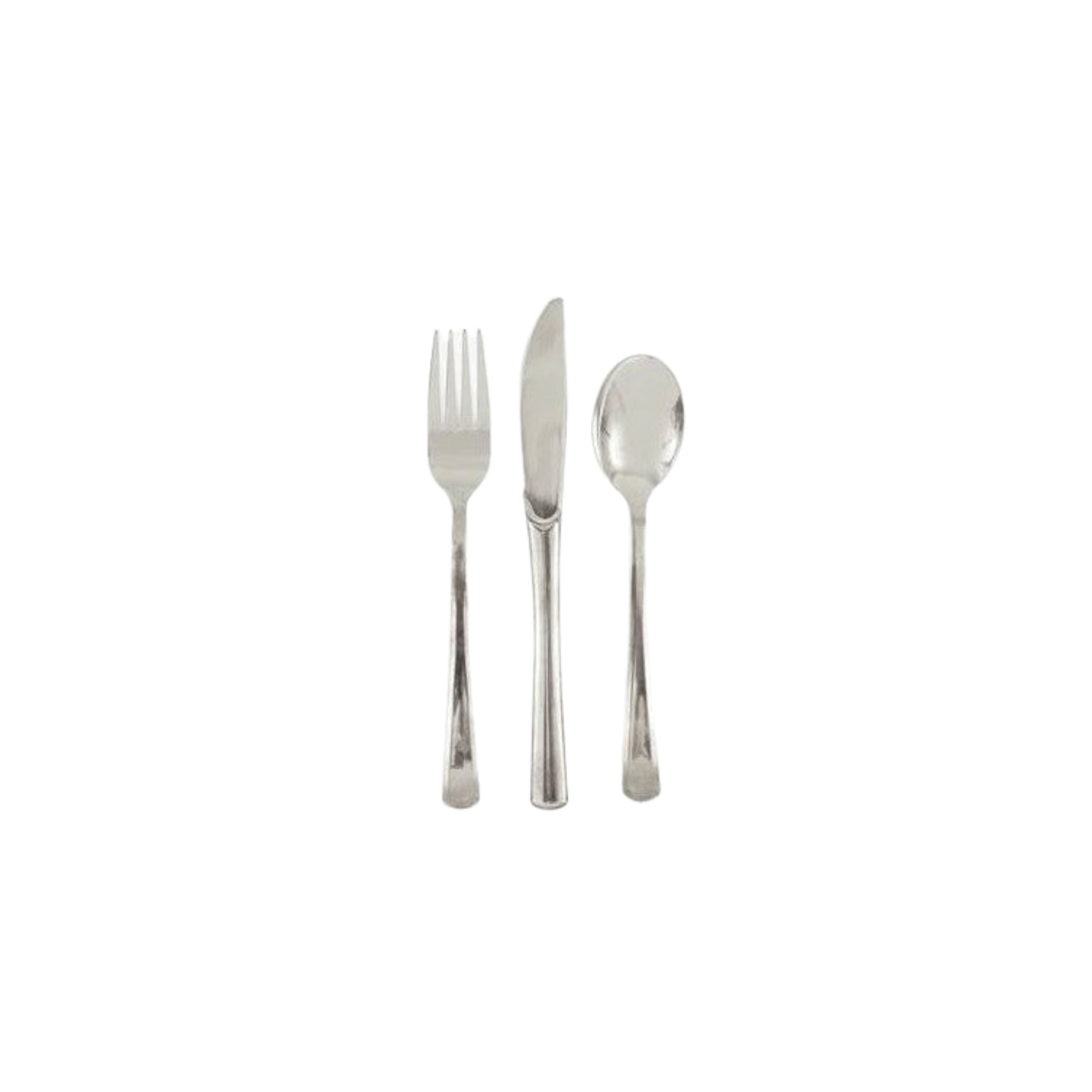 Set de 18 cubiertos desechables en color plata, perfectos para eventos elegantes y celebraciones.