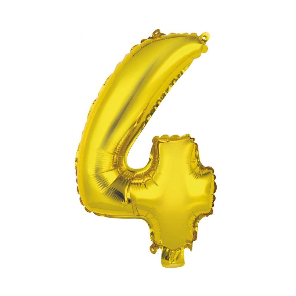 Globo metalizado en color dorado con número 4, ideal para fiestas.