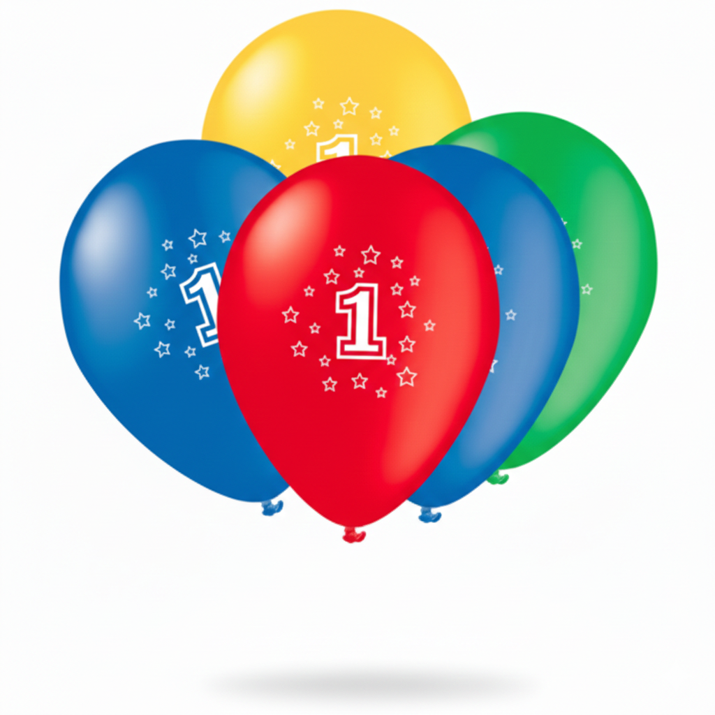 Pack de 5 globos de látex surtidos con número 1, ideales para primeros cumpleaños.