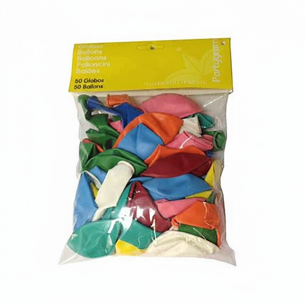 Pack de 50 globos de látex en colores surtidos, ideales para decorar cumpleaños, fiestas y eventos infantiles.