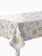 Mantel plástico con diseño de copos de nieve en tonos dorados, ideal para celebraciones especiales.