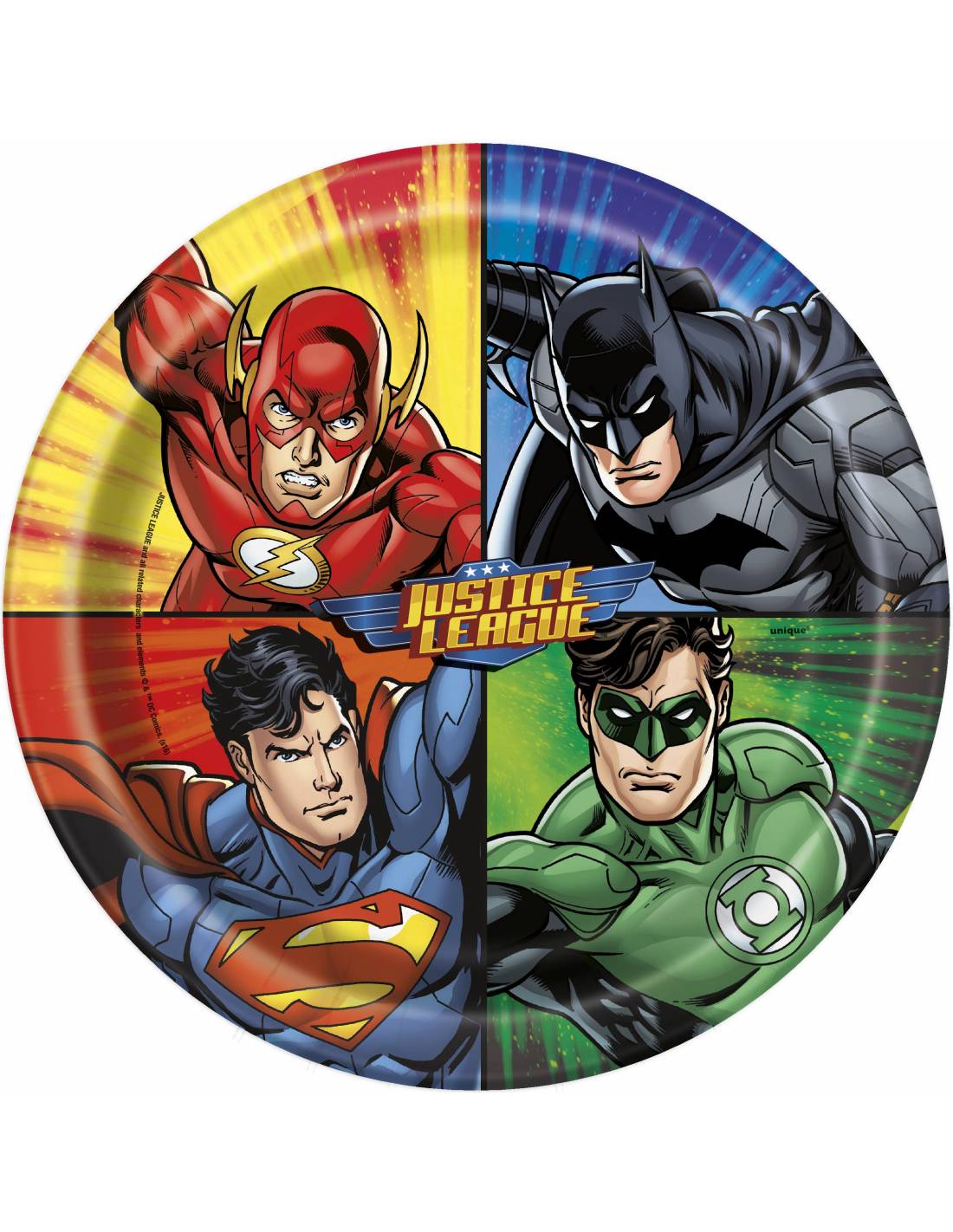 Pack de 8 platos de cartón con temática de superhéroes, ideales para fiestas infantiles.