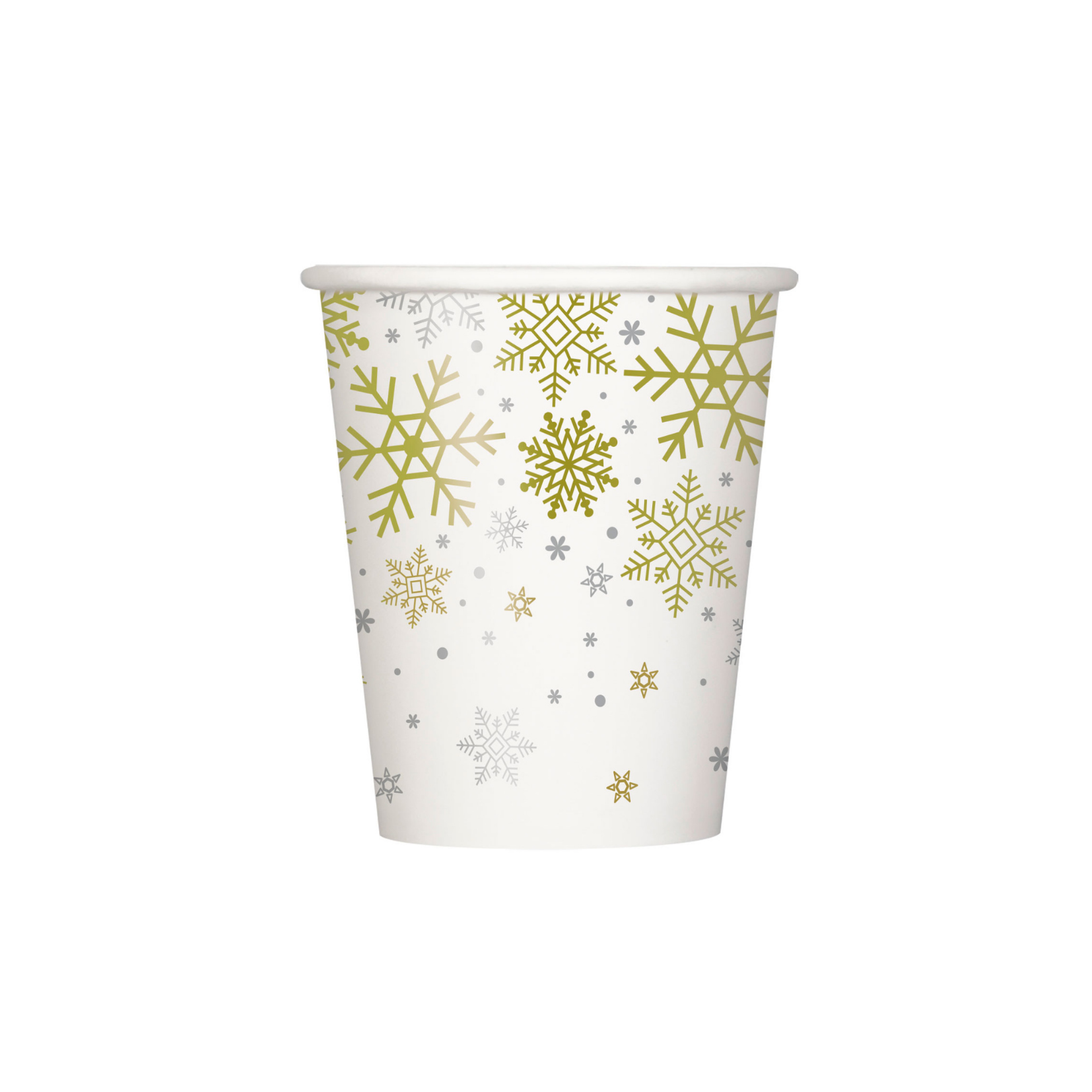 Pack de 8 vasos de cartón con diseño de copos de nieve en tonos plata y oro, ideales para celebraciones especiales.