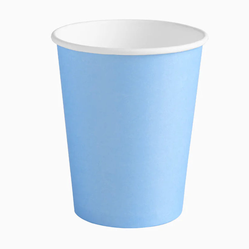 Pack de 8 vasos de cartón de color azul, ideales para fiestas infantiles y cumpleaños.