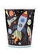 Pack de 8 vasos de cartón con temática del espacio exterior, ideales para fiestas infantiles.
