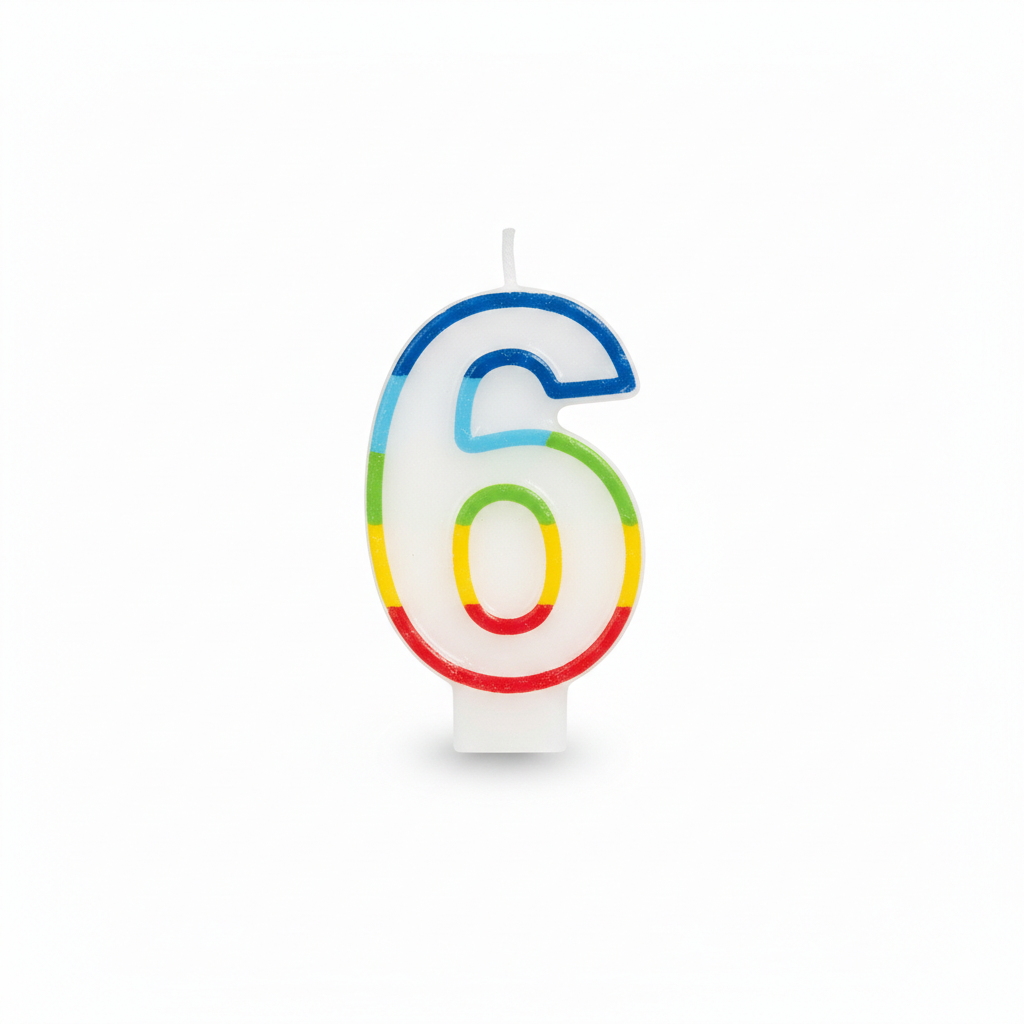 Vela decorativa con diseño arcoíris y número 6, ideal para cumpleaños.