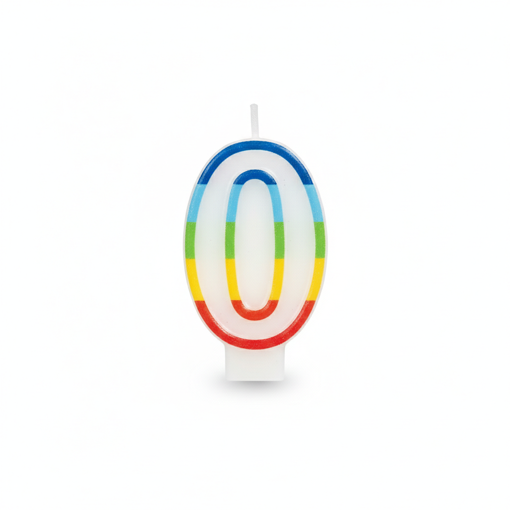 Vela decorativa con diseño arcoíris y número 0, ideal para combinar edades.