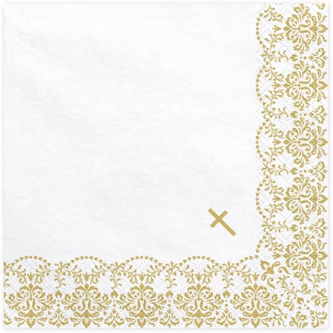 Pack de 20 servilletas decorativas con bordado dorado perfectas para comunión, bautizo y confirmación.